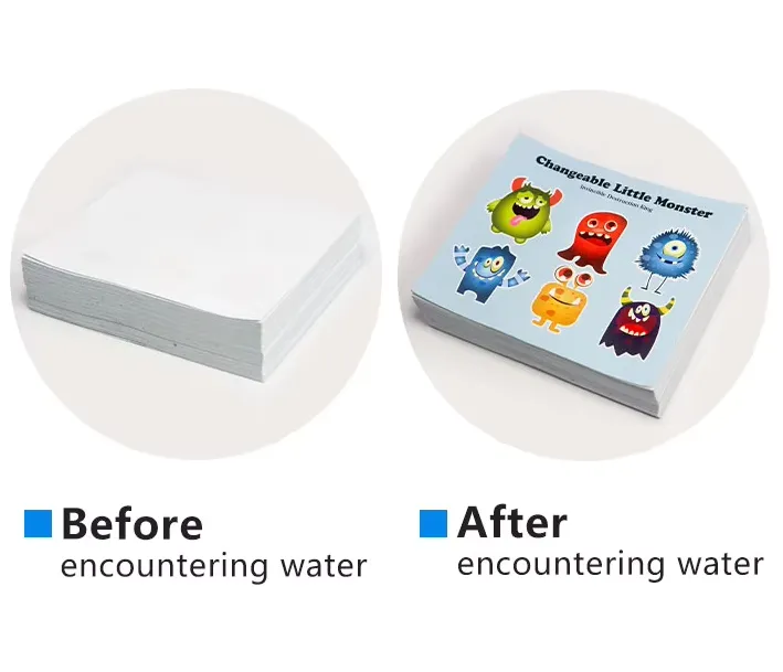 నీటిలో ముంచినప్పుడు, అది వెంటనే పేస్ట్ లాంటి స్థితికి మారుతుంది మరియు త్వరగా చెదరగొట్టబడుతుంది. దాని మీద ముద్రించిన రంగులు తదనుగుణంగా వ్యాప్తి చెందుతాయి మరియు వికృతమవుతాయి. రంగు మార్చే ప్రక్రియ కోలుకోలేనిది. నీటికి ఒకసారి బహిర్గతమైతే, అది శాశ్వతంగా రంగును ప్రదర్శిస్తుంది.