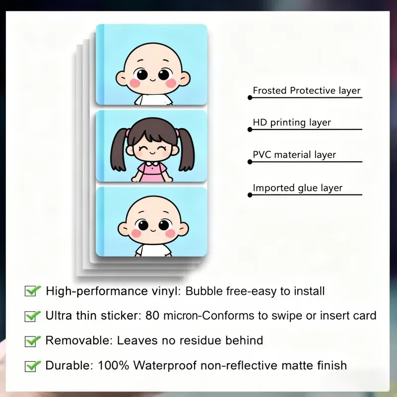 క్రెడిట్ కార్డ్ స్కిన్ సాధారణంగా PVC ప్లాస్టిక్ వంటి పదార్థాలతో తయారు చేయబడింది, ఇది సన్నగా ఉంటుంది, అతికించడానికి మరియు తీసివేయడానికి సులభంగా ఉంటుంది మరియు మన్నిక మరియు దీర్ఘకాలం కనిపించేలా ఉండేలా వాటర్ప్రూఫ్ మరియు స్క్రాచ్-రెసిస్టెంట్ మ్యాట్ ఉపరితలాన్ని తరచుగా కలిగి ఉంటుంది. ఇది వాటర్ప్రూఫ్, కన్నీటి-నిరోధకత మరియు అధిక-రిజల్యూషన్ UV ప్రింటింగ్కు అనుకూలంగా ఉంటుంది.