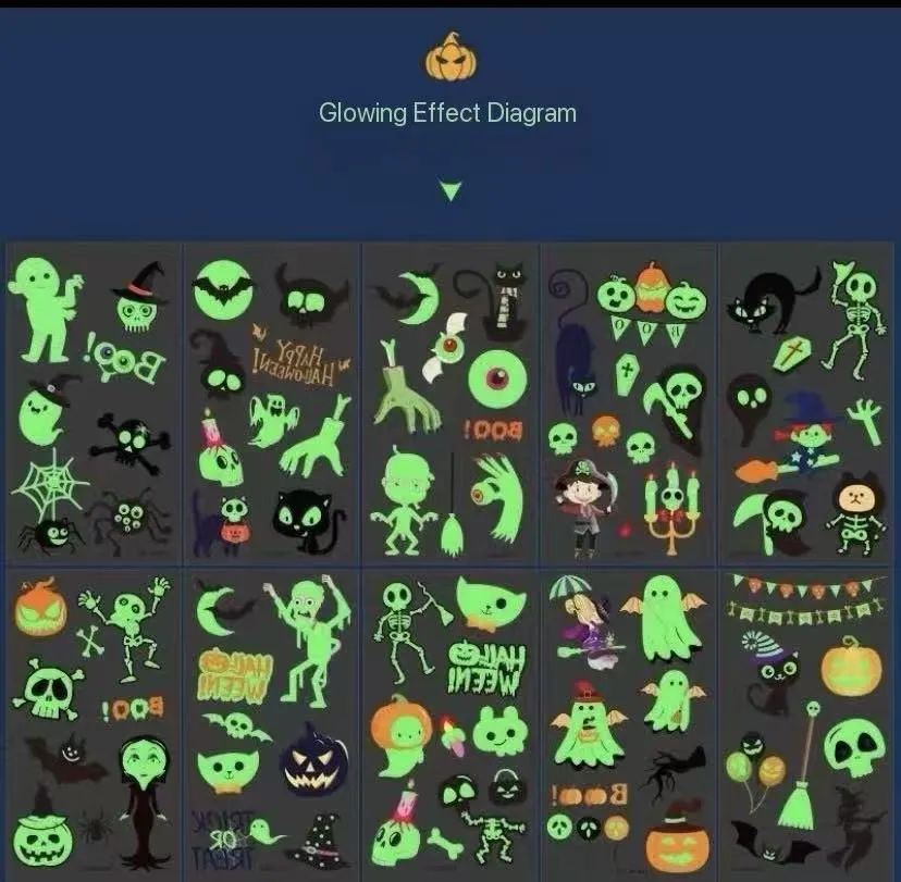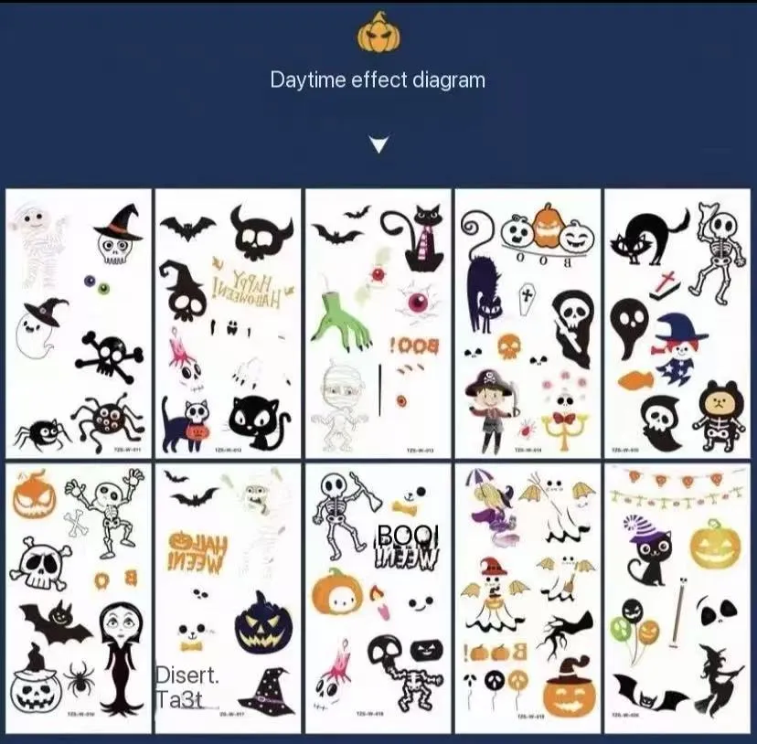 జోజో ప్యాక్ నిర్మించిన హాలోవీన్ నైట్ గ్లో టాటూ స్టిక్కర్లు ఈ మర్మమైన మరియు ఆనందకరమైన పండుగ కోసం ప్రత్యేకంగా రూపొందించిన ప్రత్యేకమైన అలంకరణలు, ఇందులో గొప్ప రకాల హాలోవీన్ అంశాలు ఉన్నాయి. ఈ నమూనాలు కేవలం సాధారణ అలంకరణలు కాదు; వారు హాలోవీన్ వాతావరణాన్ని సంపూర్ణంగా పొందుపరుస్తారు, పండుగ సందర్భంగా మిమ్మల్ని దృష్టి కేంద్రీకరిస్తారు.