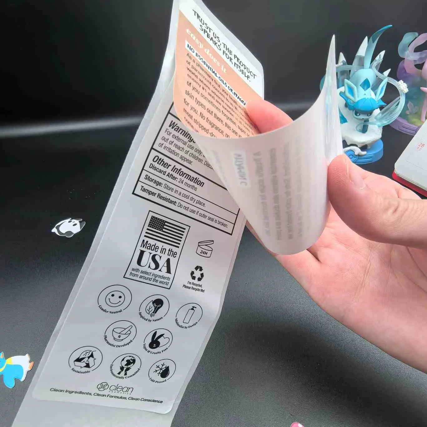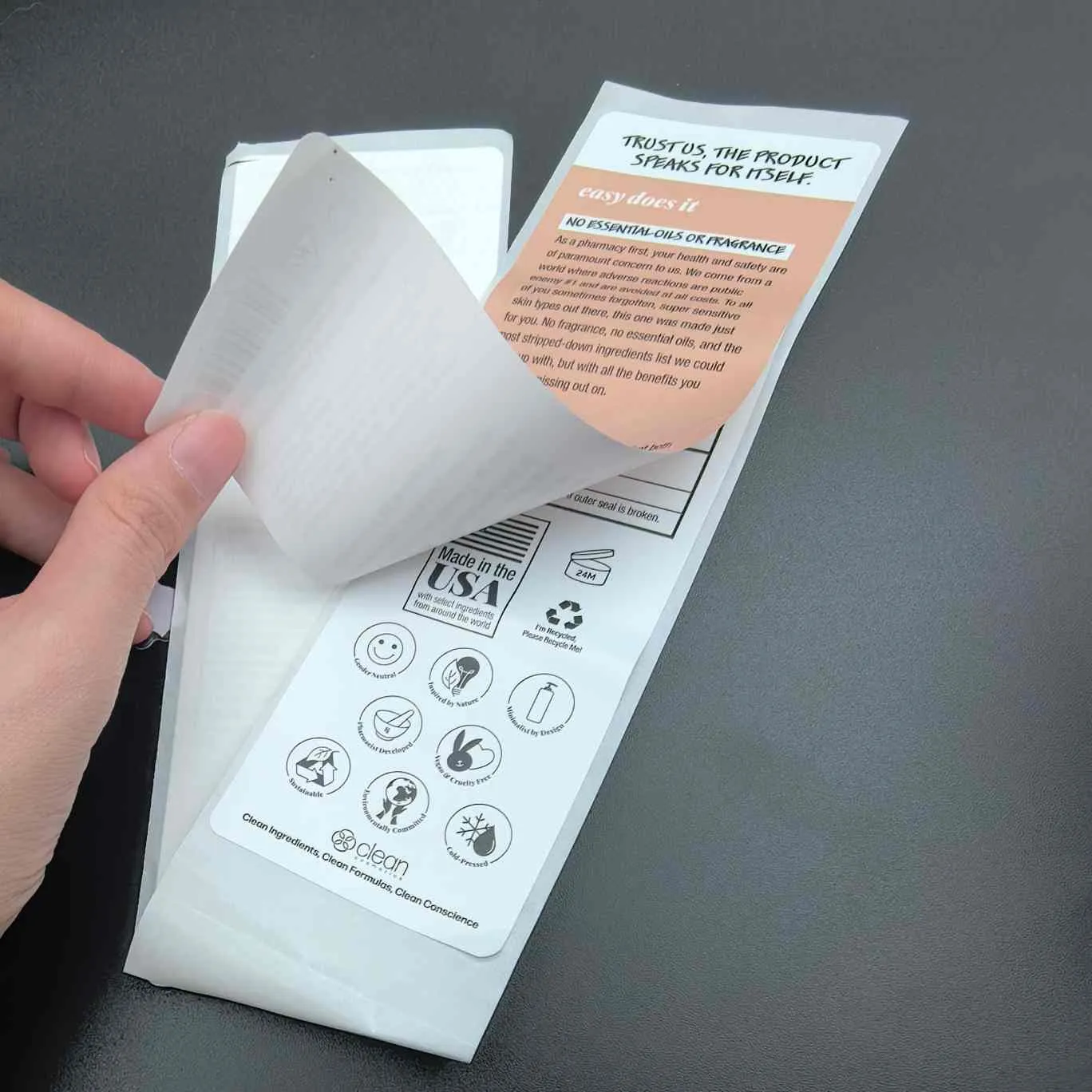 జ: ఇది సౌందర్య సాధనాల కోసం 2+ లేయర్లతో కూడిన లేబుల్. లేబుల్ పరిమాణాన్ని విస్తరించకుండా లోపలి పొరపై అదనపు సమాచారాన్ని బహిర్గతం చేయడానికి బయటి పొరను పీల్ చేయండి.