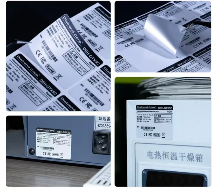 PET తెలుపు/మాట్టే వెండి: 150℃ వరకు వేడి-నిరోధకత, గృహోపకరణాలు మరియు పవర్ అడాప్టర్లపై నేమ్ప్లేట్లకు అనుకూలం.