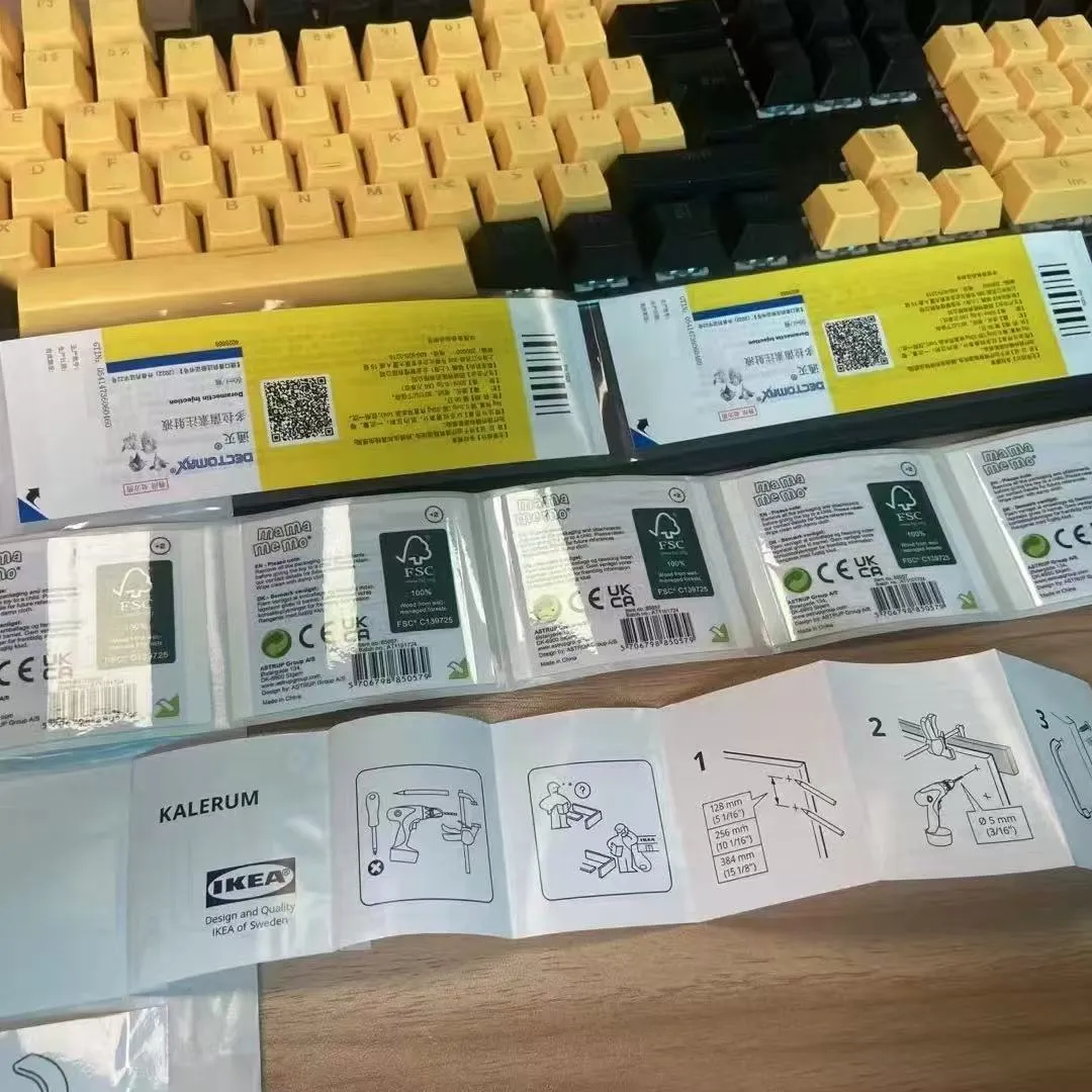 బాటిల్ బాడీలు, టెస్ట్ ట్యూబ్లు మరియు చిన్న ఎలక్ట్రానిక్ పరికరాల వంటి అత్యంత పరిమిత ఉత్పత్తి ఉపరితలాలపై మడతపెట్టిన లేబుల్లు వాటి కవరేజ్ ఏరియా యొక్క ప్రింటింగ్ స్థలాన్ని అనేక రెట్లు అందిస్తాయి. మడతపెట్టిన లేబుల్ల సమాచారం లేయర్లుగా ఉంటుంది: బయటి పొర అనేది ఉత్పత్తి పేరు మరియు లోగో వంటి సారాంశ సమాచారం మరియు లోపలి లేయర్ పదార్ధాల జాబితా, వినియోగ సూచనలు, బార్కోడ్, బహుభాషా అనువాదం మొదలైన వివరణాత్మక సమాచారం.