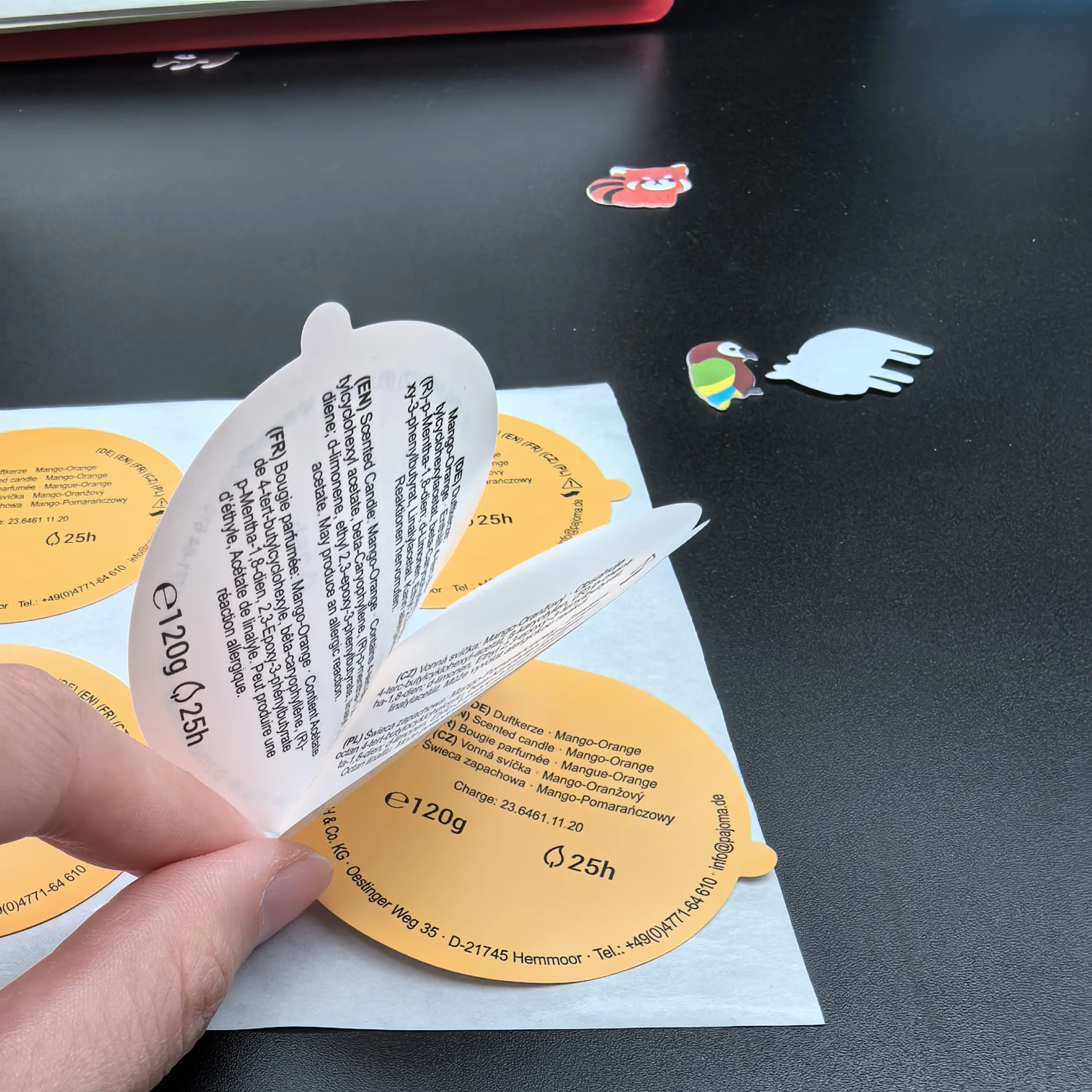 మడతపెట్టిన లేబుల్లు సాధారణంగా ఒక వైపు అంటుకునే మరియు మిగిలినవి ముడుచుకున్న పొడవైన స్టిక్కర్గా ఉంటాయి. విప్పినప్పుడు, అది మినీ బుక్లెట్లా కనిపిస్తుంది. మడతపెట్టిన లేబుల్ల విషయానికి వస్తే, అంటుకునే-పూతతో కూడిన దిగువ భాగం ఉత్పత్తికి జోడించబడి, ఆపై పై భాగాన్ని కవర్ చేయడానికి మడవబడుతుంది. మడతపెట్టిన దాచిన సమాచారాన్ని చూడటానికి వినియోగదారులు దాన్ని మాన్యువల్గా తిప్పాలి.